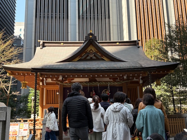 ちなみに福徳神社は、平日でも参拝客が絶えない人気ぶり。賽銭箱の前は左右を詰めても2~3人ずつしか参拝できないため、常に後ろに人が並んでいる状態です。