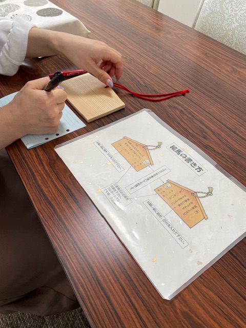 祈祷を受け終わって授与品を頂いた後は待合室の大広間へ戻り、安産絵馬にお願い事を記入。