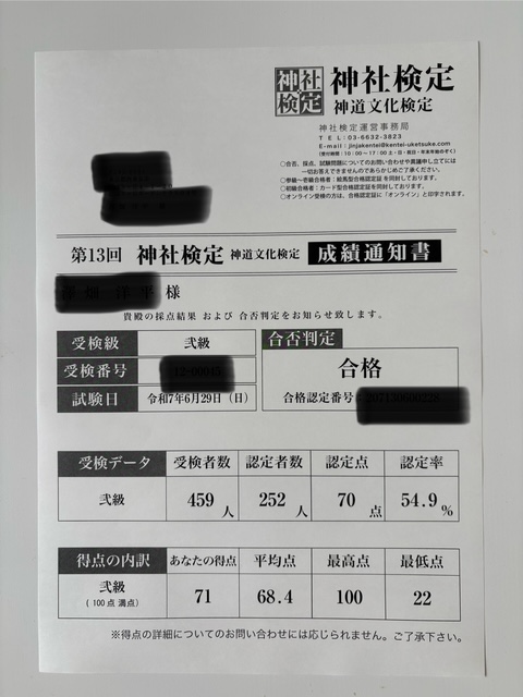 試験を受け終えた後は「落ちたかもしれない…」と正直不安になりました。午前に受けた神社検定3級が余裕だった半面、余計に難しく感じた次第です。