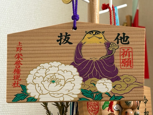 他抜(たぬき)と書かれた絵馬で、紫色の装束を纏った御狸様が描かれています。せっかくなので私も一枚購入して自宅の神棚に飾りました。